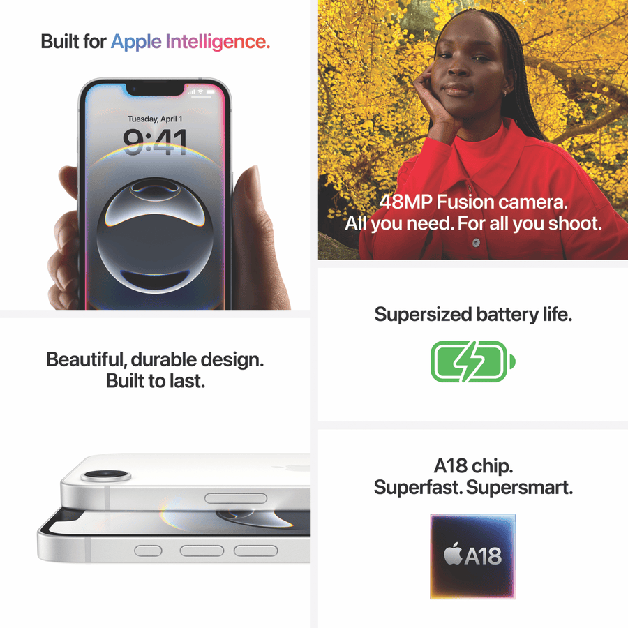 The Latest iPhone at the greatest price with the Apple iPhone 16e 256GB Black MD1T4X/A. The iPhone 16e is built for Apple Intelligence(1) to get more done effortlessly, powered by the A18 chip for productivity and gaming prowess alike including regular iOS updates for years to come. Supersized battery life gives up to 26 hours of video playback(2) on the stunning 6.1 inch OLED display with a Ceramic Shield front to protect it long term. Take great shots with the 2-in-1 rear camera system boasting a 48MP Fusion camer for super high res photos and an optical quality 2x Telephoto, also including a quality 12MP front camera for epic selfies. Customise the iPhone 16e with iOS 18 offering home and lock screen options, messages with text effects, Tapback with emoji and the Action Button for quick access to favourite apps among much more. Keep safe and private with Emergency SOS via satellite that works even without WiFi or mobile service(3), Crash Detection(4), Face ID and Apple Intelligence keeping your use and information on device where no-one including Apple can access your data. Disclaimers: (1) Apple Intelligence is available in beta on all iPhone 16 models, iPhone 15 Pro and iPhone 15 Pro Max, with Siri and device language set to English (Australia, Canada, Ireland, New Zealand, South Africa, UK or US), as an iOS 18 update. Additional features and languages will be available in April, with more languages coming over the course of the year. Languages supported in 2025 include Chinese, English (India, Singapore), French, German, Italian, Japanese, Korean, Portuguese, Spanish and Vietnamese. (2) Battery life varies by use and configuration. (3) Emergency SOS via satellite is included for free for two years with the activation of any iPhone 14 or later model. Connection and response times vary based on location, site conditions and other factors. (4) iPhone 16 models can detect a severe car crash and call for help. Requires a mobile network connection or Wi-Fi calling.