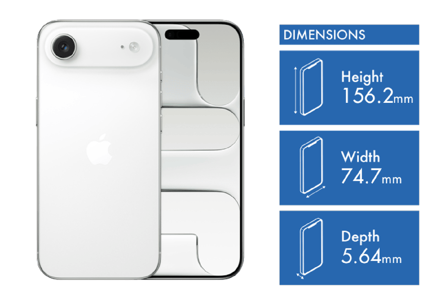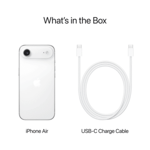 Introducing the Apple iPhone Air 1TB Cloud White MG2X4X/A. The thinnest iPhone ever. 6.5-inch display(1), durable Ceramic Shield front and back, A19 Pro chip, 48MP Fusion camera system and Center Stage front camera. The thinnest iPhone ever, with the power of a pro chip inside. At 5.6 millimetres, iPhone Air is so impossibly thin and light that it nearly disappears in your hand. Ultralight titanium frame. Ceramic Shield protects the back of iPhone Air, making it 4x more resistant to cracks(2). And the new Ceramic Shield 2 on the front has 3x better scratch resistance(3). 48MP Fusion camera system with 2x optical-quality zoom. Effortlessly frame the perfect shot from where you are. Flexible ways to frame your shot. Smarter group selfies, Dual Capture video for simultaneous front and rear recording, and more. A19 Pro is the most efficient iPhone chip yet. Gives you pro performance in a breakthrough thin and light design. All-day battery life with up to 27 hours of video playback(4). A fresh design with Liquid Glass. Beautiful, delightful and instantly familiar. With a more vibrant Lock Screen, customisable backgrounds and polls in Messages, Call Screening and more(5). Personal, private, powerful. Write, express yourself and get things done effortlessly(6). If you don’t have mobile reception or Wi-Fi, iPhone can connect to a satellite so you can contact emergency services(7). And in a severe car crash, iPhone can call for help when you can’t(8). Stay connected at faster speeds with secure connections to Wi-Fi 7(9), 5G networks(10) and Bluetooth 6, plus eSIM(11). iPhone Air activates with an eSIM. With eSIM, you enjoy greater flexibility, enhanced convenience, increased security and seamless connectivity, especially when travelling internationally. A whole new level of privacy and security. Built in.