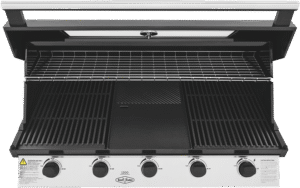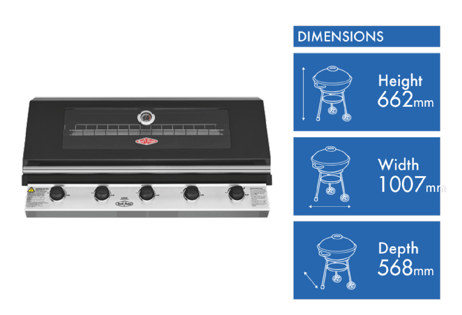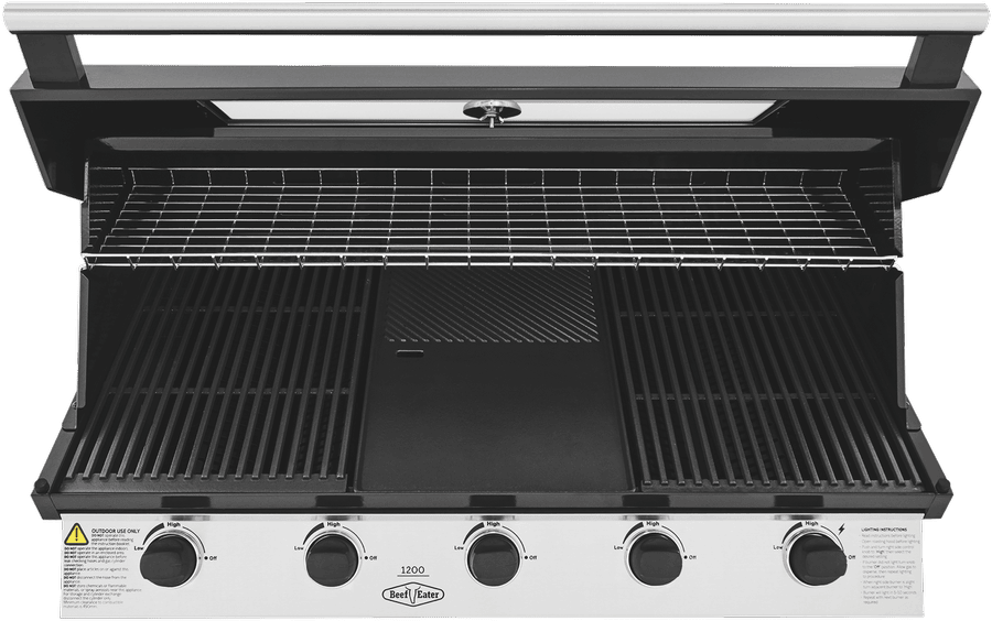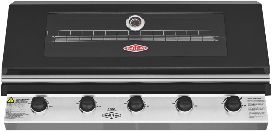 Cook up in style with the BeefEater 1200 Series Stainless Steel 5 Burner Built-in LPG BBQ with Cast Iron Burners & Grills. Sear and seal quickly with cast iron 15 megajoule burners. Evenly grill and bake with the rust resistant cast iron cooktop. Keep an eye with the large viewing window and built-in temperature gauge to ensure the lid stays closed and roasts retain their moistness. It has a warming tray that rolls away when not in use, and quartz one press start for simple ignition. The flame tamer prevents drippings from hitting the exposed fire, minimising burning. Built-in oil channels assist in keeping the whole setup clean and minimising scrubbing after the delicious barbeque.