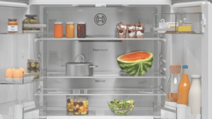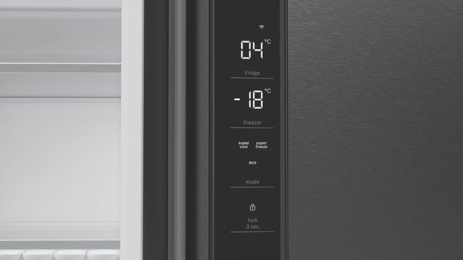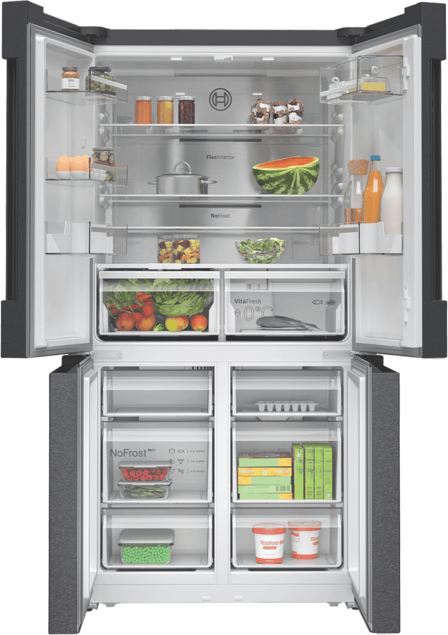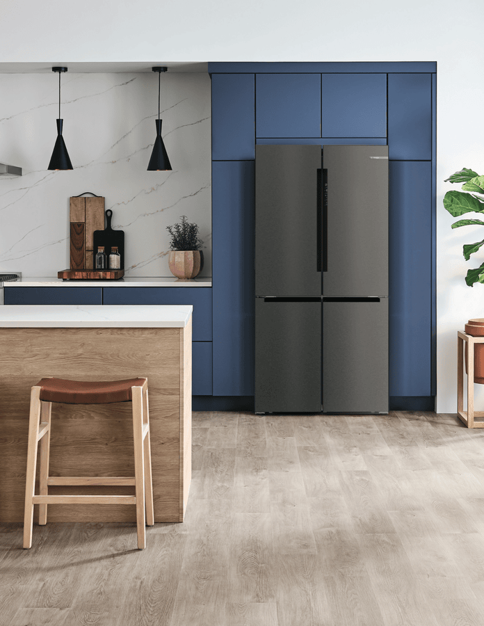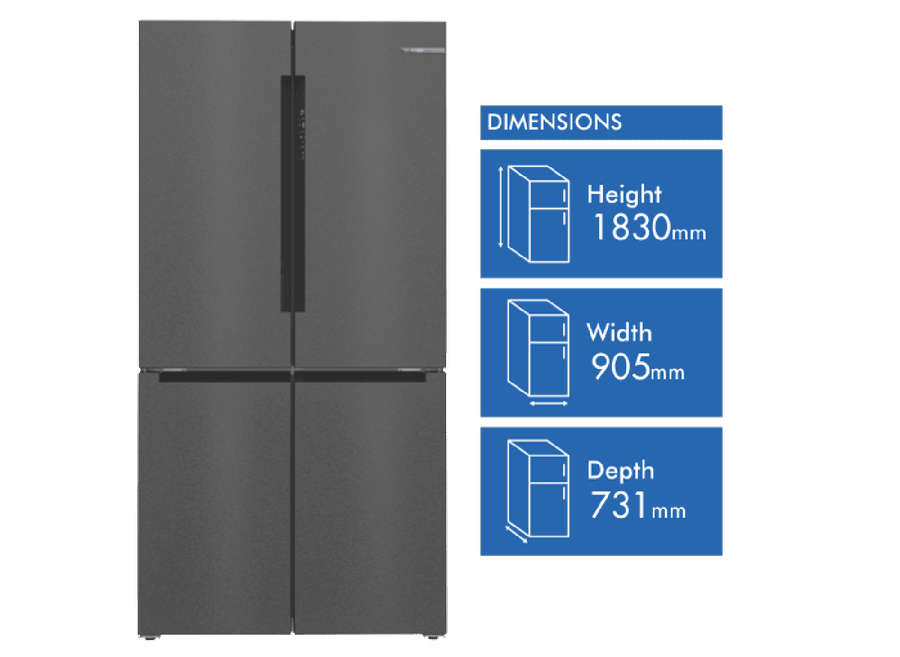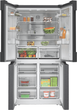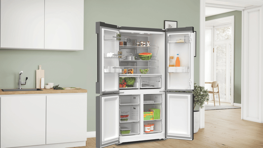 This Bosch Series 6 Quad Door Fridge keeps your food fresher for longer. With a big 605L capacity, it’s perfect for families who love to stock up. The VitaFresh Plus system helps fruits and veggies stay crisp, while the metal backwall with Multi Airflow keeps everything at just the right temperature. No more frost buildup thanks to the Total No Frost feature. The fridge even connects to your phone through the Home Connect app, so you can check on things while you’re out. With bright LED lighting, you’ll easily spot what you need. Plus, there’s a child lock to keep little hands from rearranging your groceries. The SuperCooling function quickly chills new items you’ve just added. This sleek brushed black steel fridge measures 905mm wide, 1830mm high, and 731mm deep. It comes with a 2-year warranty. The model number is KFN96AXEAA.