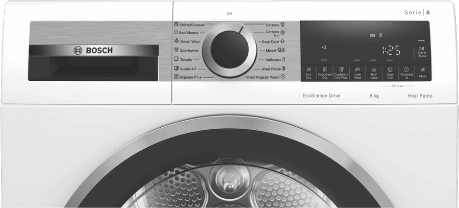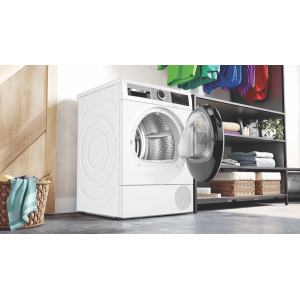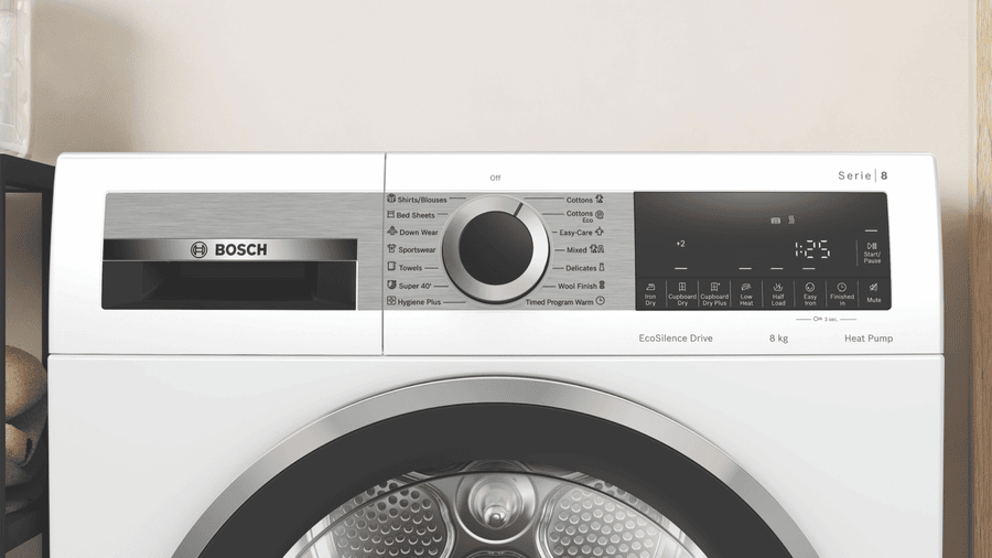 Make short work of laundry with the Bosch 8kg Heat Pump Dryer. With its large 8kg capacity, this clothes dryer lets you dry more in one load, saving you time spent doing laundry. The innovative heat pump technology gently dries clothes at lower temperatures, protecting fabrics while achieving an impressive 9 star energy rating for efficiency. Select from 10 drying programs like Cotton, Easy Care, and Delicates to customize cycles to your wardrobe. The special Bed Linen program utilizes the reversible drum action to thoroughly dry bulky linens. ActiveAir technology circulates air evenly for consistent drying, while the SelfCleaning Condenser prevents lint buildup inside the dryer. Load your clothes, select your preferred dryness level, and let the intelligent sensor take care of the rest for optimized results. With handy features like delay start, half load, and auto dry, this dryer takes the guesswork out of laundry day. The sleek white finish and LED display add style and modern appeal to any laundry room. Backed by Bosch’s 2 year warranty, the Bosch 8kg Heat Pump Dryer makes easy work of laundry so you can spend more time doing the things you love. The manufacturer’s part number for this product is WQG235D8AU. Learn more about the benefits this innovative clothes dryer can provide your household.