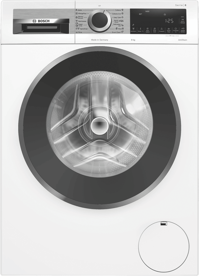 Bring sleek design and intelligent washing technology into your home with the Bosch Series 8, 9kg Front Load Washer. This white freestanding washing machine not only looks great, but also delivers powerful cleaning performance. With a generous 9kg load capacity, you can wash more in one go, saving you time. The EcoSilence drive motor is whisper-quiet yet highly efficient. Vibration is significantly reduced thanks to the AntiVibration panels and stable design. The ActiveWater system automatically adjusts water usage based on the size of each load, helping you conserve water. An impressive 1400rpm max spin speed removes more moisture from clothes to cut down drying time. The AntiStain and super quick 15 minute cycles target tough stains. The self-cleaning detergent drawer prevents residue buildup. The intuitive LED display, reload function and delay start provide added convenience. For peace of mind, AquaStop flood protection stops water flow if a leak occurs. With a 5 star energy rating and 4.5 star water rating, this Bosch washer helps reduce your utility bills. Bring home the Bosch Series 8 Front Load Washer today for an effortless laundry experience. The manufacturer’s part number for this product is WGG24402AU.