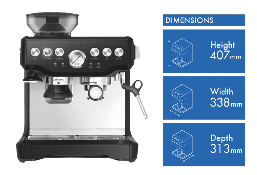 Kick start your day with cafe-quality coffee from the comfort of home with this Breville the Barista Express BES870BTR – the perfect coffee machine for both beginner baristas and more experienced coffee makers. Simply add your favourite roasted beans to the bean hopper, then press a button to let the machine grind and dose your portafilter with the right amount of freshly grounded coffee for a delicious tasting brew. Select your preferred cup volume and the machine’s automatic dosing will dispense the required amount of coffee. It has an adjustable grind size dial for coffee your way. To create cappuccino, flat white or latte, use the steam wand to texture and heat the milk to a silky-smooth consistency. This Breville espresso machine uses preinfusion to gradually increase water pressure to gently expand grinds for even extraction. Plus, it automatically adjusts the water temperature after steam for optimal espresso temperature. You can experience an authentic tasting espresso or milky coffee favourite with this Breville the Barista Express coffee machine in black truffle.