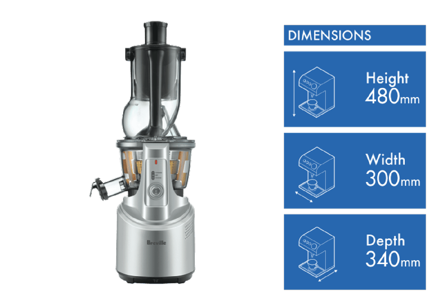 Make juicing easy with the Breville The Big Squeeze Slow Juicer. This powerful 2400-watt juicer features a large feed chute designed to easily accommodate whole fruits and vegetables, eliminating the need for pre-chopping. The two speed settings allow you to customize juicing for soft or hard ingredients. The 1.5L pulp container and 1.2L juice jug let you juice large batches in one go. At 300mm wide, 480mm high and 340mm deep, this compact juicer takes up minimal counter space. Weighing just 7.4kg, it’s easy to move and store. Standout features like the ultra-quiet motor, Quick Rinse technology and Big Squeeze slow juicing deliver the ultimate juicing experience. With a 5-year warranty, you can juice every day with confidence. This Breville juicer makes it simple to enjoy fresh, nutritious juice at home. The manufacturer’s part number for this product is BJS700SIL. Discover how easy and delicious juicing can be with the Breville The Big Squeeze Slow Juicer.
