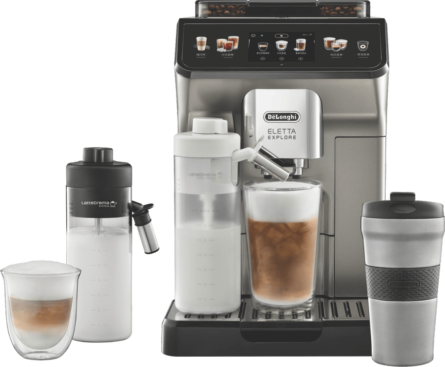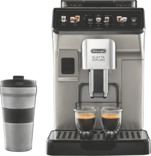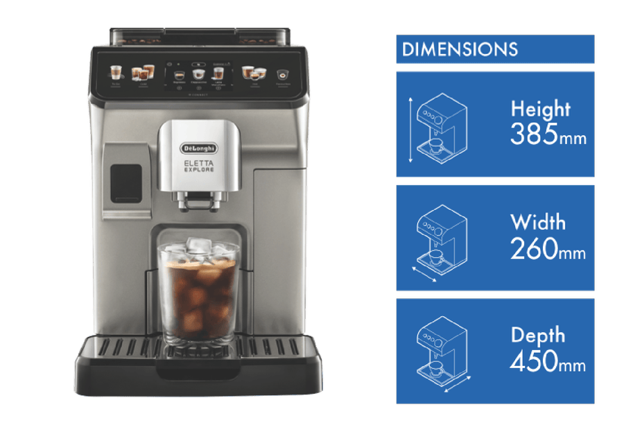 Brew barista-quality coffee from the comfort of your own home with the DeLonghi Eletta Explore Wifi Connect Titan automatic coffee machine. This sleek titanium automatic coffee machine allows you to easily craft delicious espresso, long blacks and lattes at the touch of a button. With a powerful 19 bar pump and patented LatteCrema system, the Eletta Explore delivers creamy milk froth and optimally extracted coffee every time. Connect via WiFi to access 5 customizable user profiles, adjust grind size, coffee strength and milk temperature, and more through the intuitive 3.5″ TFT display. The integrated conical burr grinder with 13 adjustable settings grinds beans fresh for each brew, while the removable 1.8L water tank and dishwasher safe parts make cleaning and descaling easy. Brew coffee just the way you like it with the Eletta Explore’s wide range of features. The manufacturer’s part number for this product is ECAM45086T. Make your choice today with this user-friendly bean-to-cup automatic coffee machine from DeLonghi.