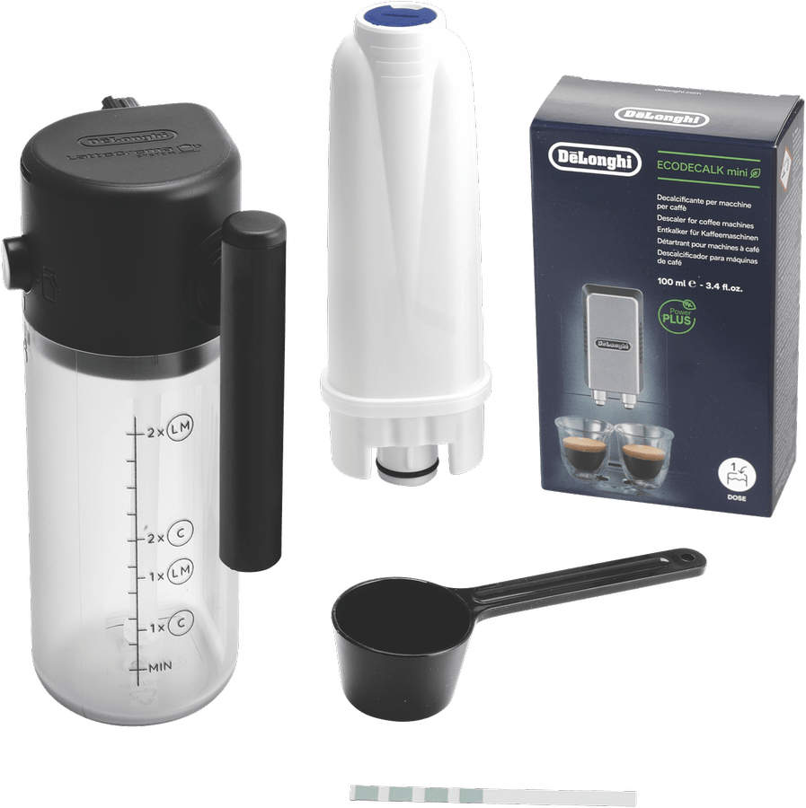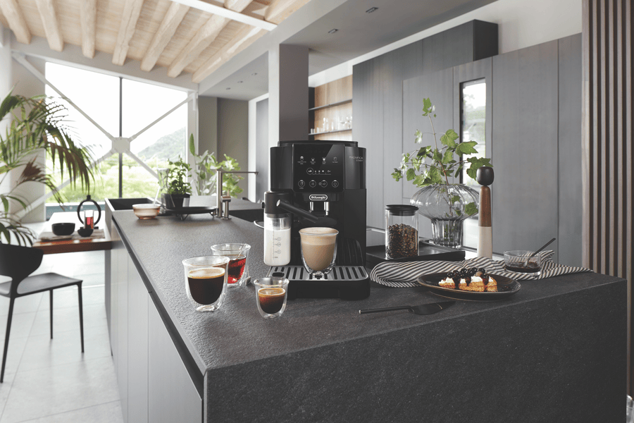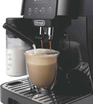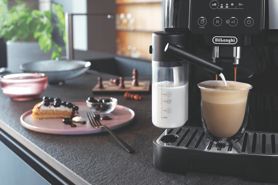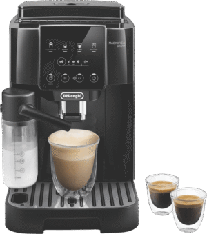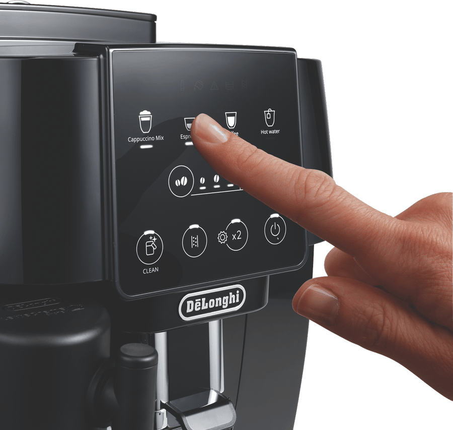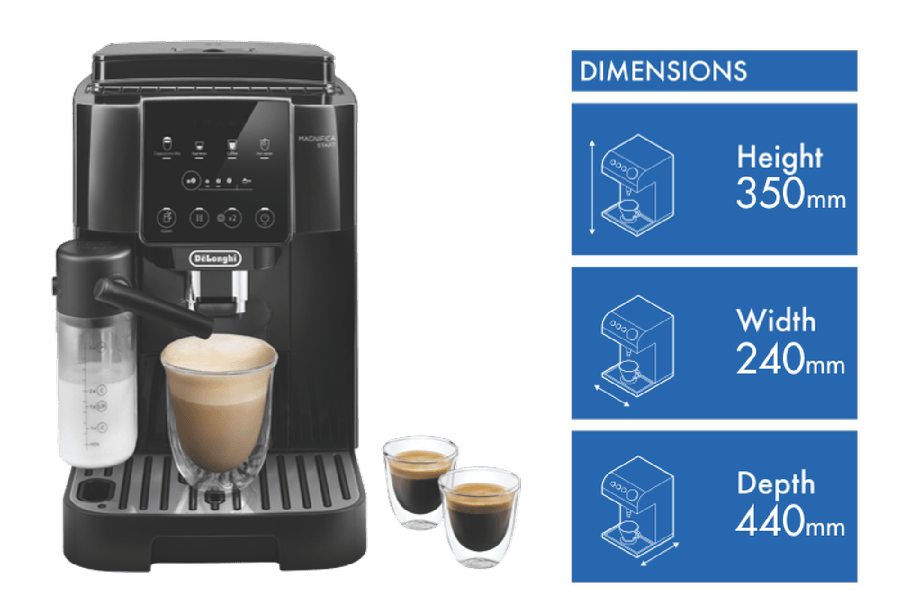 Indulge in barista-style coffee drinks from the comfort of home with the DeLonghi Magnifica Start With Milk Fully Automatic Coffee Machine. With a powerful 15 bar pump pressure and integrated conical burr grinder with 13 adjustable settings, this machine delivers authentic cafe-quality espresso, long blacks and more at the touch of a button. Four one-touch recipes for espresso, coffee, cappuccino and hot water make operation simple. The integrated milk frother lets you effortlessly create creamy cappuccinos and lattes. With a large 1.8 litre removable water tank, bean container holding 250g and intuitive control panel, this is a user-friendly fully automatic coffee machine that makes it easy to create coffeehouse beverages for the whole family. The durable stainless steel finished machine looks sleek in any kitchen. Experience the aroma and full flavor of fresh espresso from the comfort of home with this versatile automatic coffee machine. ECAM22063B is the manufacturer’s part number for this product.