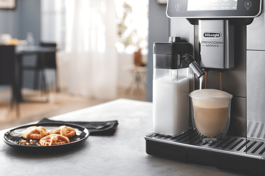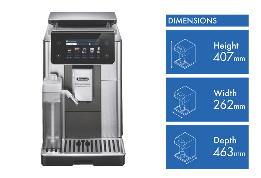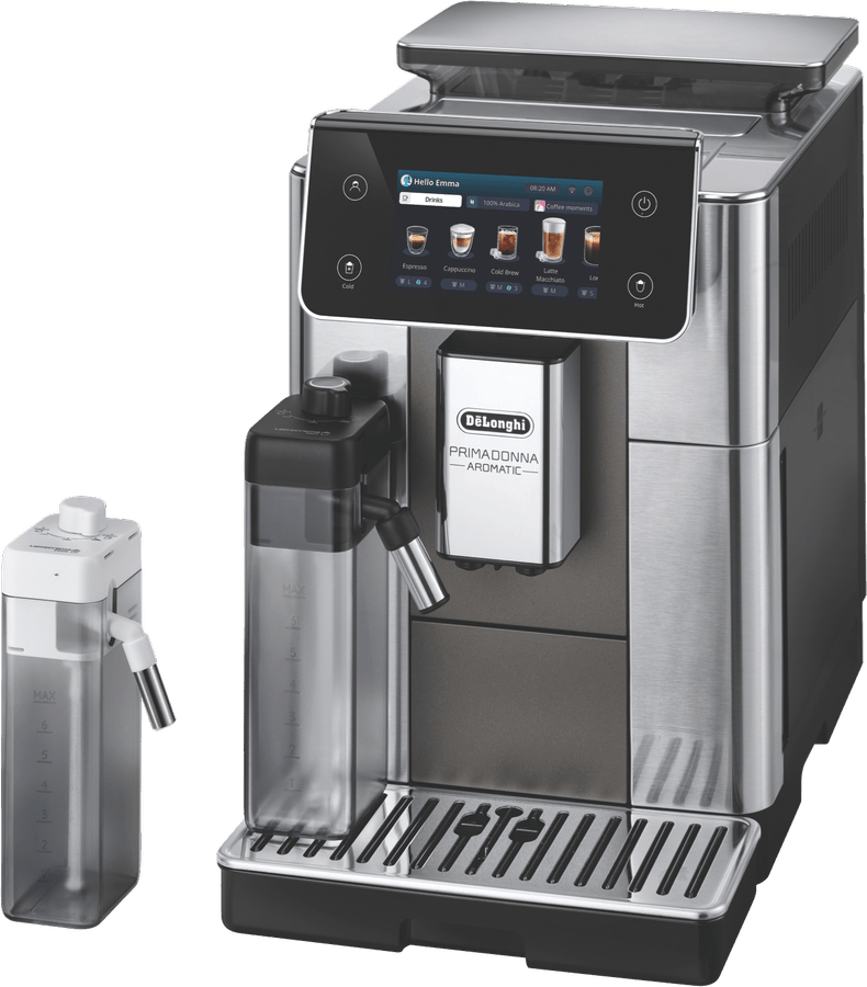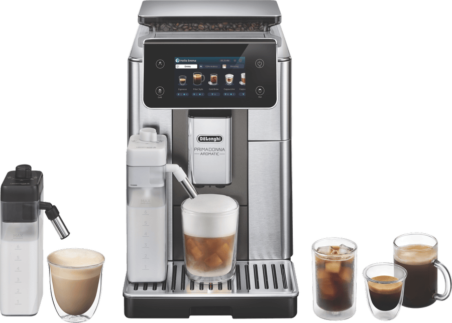 Make barista coffee at home with the PrimaDonna Aromatic Fully Automatic Coffee Machine. This silver beauty features a powerful 19 bar pump and built-in grinder to extract perfect flavour from your beans. The 2.2 litre water tank lets you brew up to 14 shots before refilling, while the included LatteCrema Hot and Cool carafes create microfoam for both hot and iced coffees. Control everything through the intuitive touch screen, choosing from 37 customisable recipes that can be saved across four user profiles. Comes with a 2-year warranty. Model ECAM63075TM.