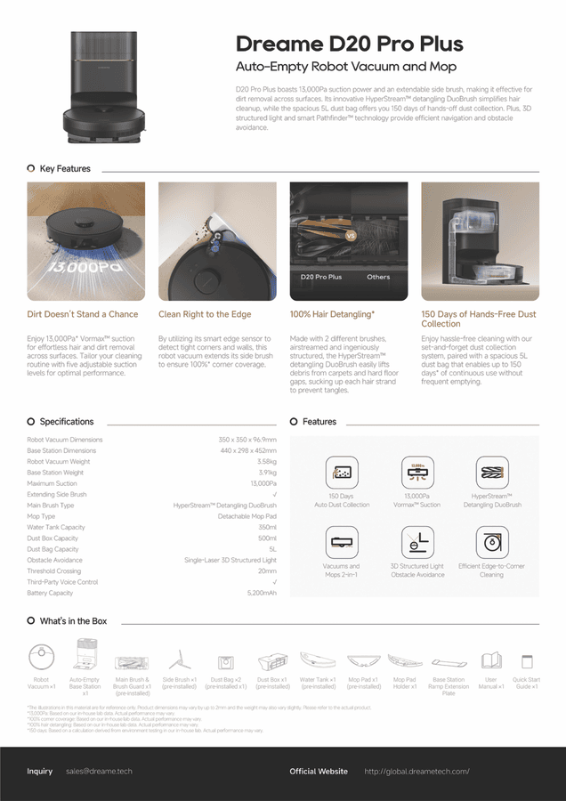 D20 Pro Plus boasts 13,000Pa suction power and an extendable side brush, making it effective for dirt removal across surfaces. Its innovative HyperStream(TM) detangling DuoBrush simplifies hair cleanup, while the spacious 5L dust bag offers you 150 days of hands-off dust collection. Plus, 3D structured light and smart Pathfinder(TM) technology provide efficient navigation and obstacle avoidance.