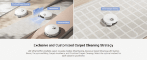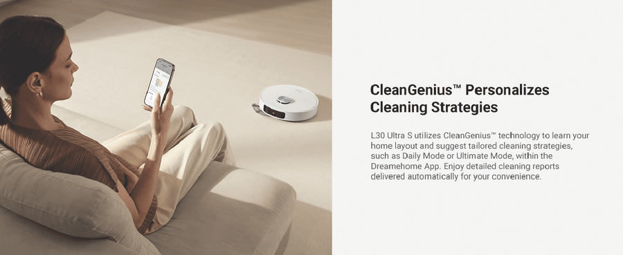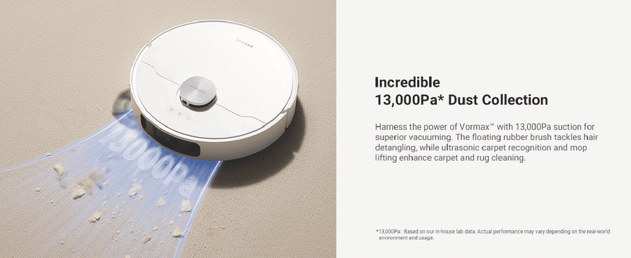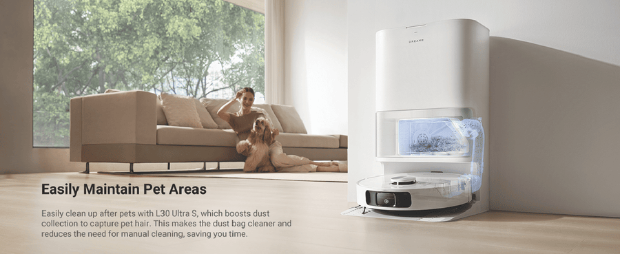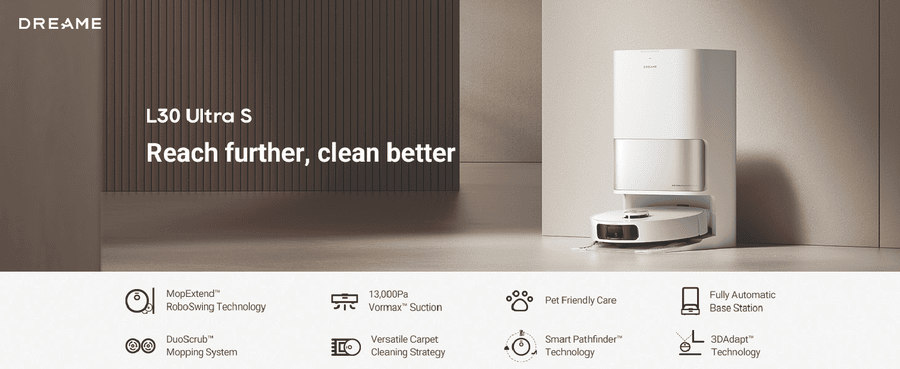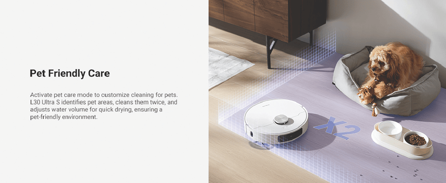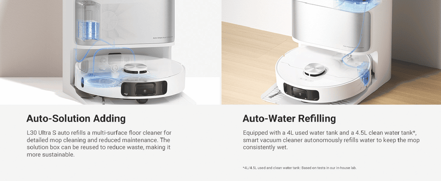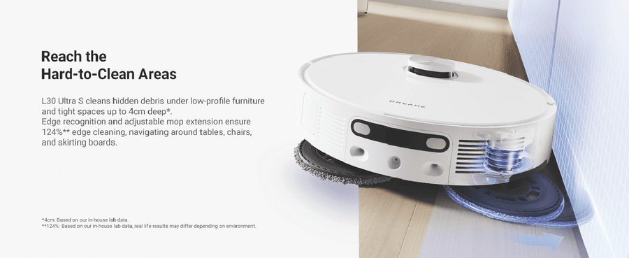 L30 Ultra S ensures comprehensive cleaning of hard-to-reach areas with MopExtendTM RoboSwing Technology. Its powerful 10,000Pa suction quickly picks up paper scraps, cat litter, dust, and hair. Keep pet areas clean, reduce manual cleaning, and minimize hair entanglement and ground moisture for healthier pets. Enjoy customized carpet cleaning, up to 75 days of auto-emptying, automatic mop-cleaning, hot air drying, and automated water refilling for weeks of hands-free cleaning. MopExtend RoboSwing Technology Effortlessly reach tight spots up to 4cm(1) deep by twisting and navigating around tables, chairs, and skirting boards, ensuring thorough dirt removal along edges. 13,000Pa(2) of Suction Power Unleash powerful 13,000Pa suction to tackle dirt and hair. The floating rubber brush easily manages hair, while ultrasonic carpet recognition and mop lifting enhance carpet and rug cleaning. Fully Automatic Base Station Maintain your robot vacuum effortlessly with 75 days(3) of auto-emptying, mop washing and drying, water refilling, solution adding. and more. Enjoy a truly hands-free cleaning experience like never before. Customized Carpet Cleaning Strategy L30 Ultra S offers multiple carpet cleaning modes, vacuum and mop, mop raising, intensive carpet cleaning and suction boost, carpet avoidance, and more. Letting you choose the best method for each carpet in your home. Disclaimers: (1) 4cm: Based on our in-house lab data. (2)13,000Pa based on our in-house lab data Actual performance may vary depending on the real world. (3)75 days: Based on a calculation derived from environment testing in our in house lab. Actual performance may vary depending on the real-world environment and usage