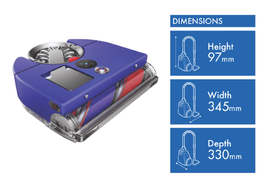 Dyson’s 360 Vis Nav(TM) Robot Vacuum (304640-01) provides 360° vision in the most powerful robot(1), it sees where it needs to clean and remembers where it’s been, just like you would. 26 sensors for obstacle avoidance and dual-link suspension so it doesn’t get stuck. An extending side duct automatically redirects suction, powerful enough to capture dust and debris right up to the wall. A low profile allows the robot to clean under furniture, while an LED light ring helps it navigate in low light and corners. Clean wherever you are, control, customise and schedule your robot remotely with the MyDyson(TM) smart home app. Clean your home, whether you’re there or not. Dyson’s fully sealed HEPA filtration system traps dust and seals in 99.99% of particles as microscopically small as 0.1 microns(2). Deep cleans on all floors with full-width brush bar that cleans right to the edge. Black anti-static carbon fibre filaments extract fine dust from hard floors, stiff nylon bristles remove ground-in dirt from carpets, and soft woven nylon captures large debris, Engineered with a wide diameter to reduce hair tangling. Set you robot to Quiet mode to keep things peaceful for pets. Up to 50 minutes of run time(3) it intelligently monitors battery level and returns to dock to recharge when needed, before going back to finish the job. Set rules and routines, switch off the brush bar motor for quiet spaces and deep-pile rugs, define no-climb zones, or set areas to avoid altogether. A lifetime of easy maintenance, clean after clean, your robot will tell you when it needs attention and guide you with simple instructions. Empty the bin in a single, hygienic action. The brush bar and lifetime filter can be washed, ready to go again. Disclaimers: (1)Suction testing based on IEC 62885-4 CL5.8 and CL5.9, loaded to bin full, in Boost mode against robot vacuums (market sales data from Jan 2022 to Dec 2022). Tested in SLG Germany from 2021-2023.(2)Filtration tested against ASTM F3150 in Boost mode by independent third party, SGS US, in 2022.(3)In Quiet mode in unobstructed environment. Actual run time may vary based on power mode, floor type.(4)Suction testing based on IEC 62885-4 CL5.8 and CL5.9, loaded to bin full, in Boost mode. Tested in SLG Germany in 2021.(5)Suction power automatically reacts in Auto mode only. Microscopic dust is defined as particles smaller than 100 microns