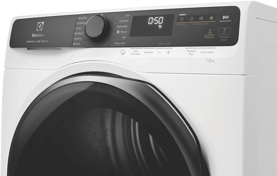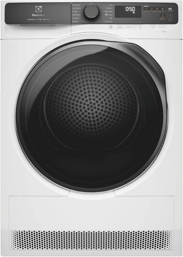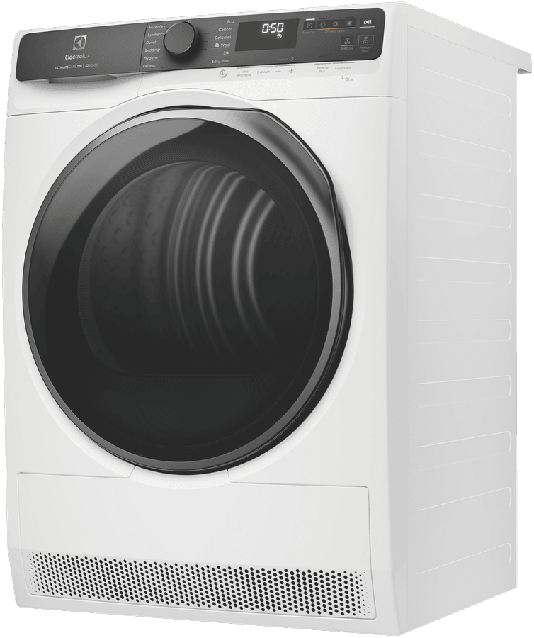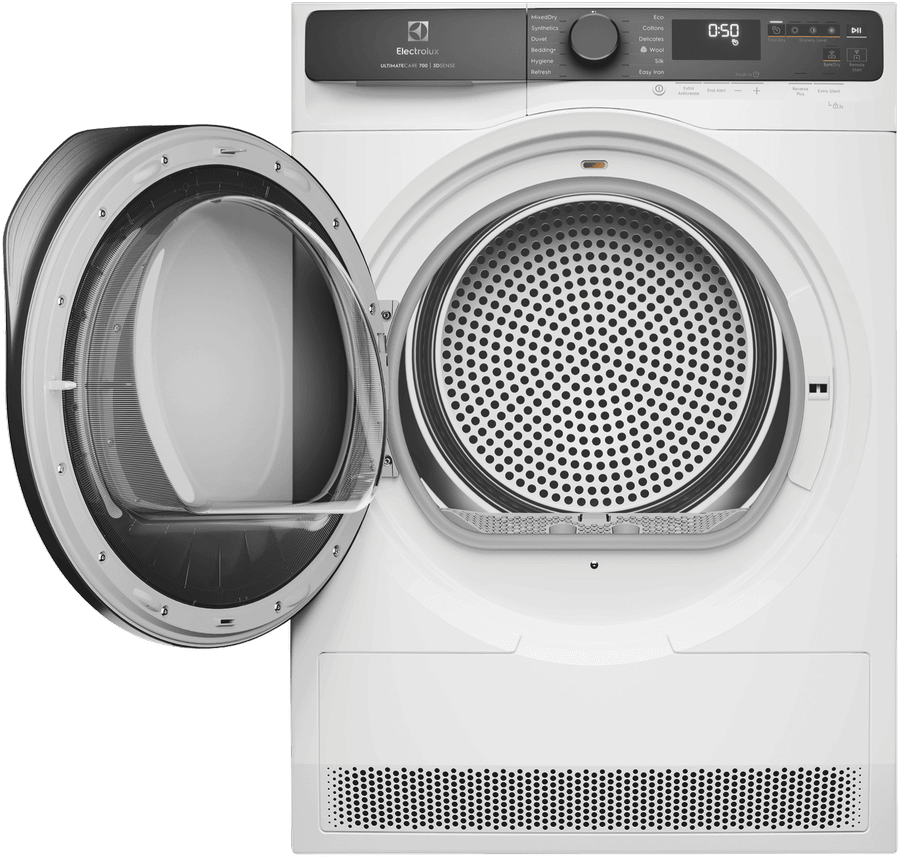 9kg UltimateCare 700 heat pump dryer with 9 star energy efficiency. Wi-Fi enable, featuring Woolmark Blue certification, advanced 3DSense technology, refresh cycle, and reverse tumbling action