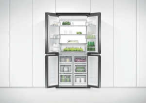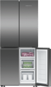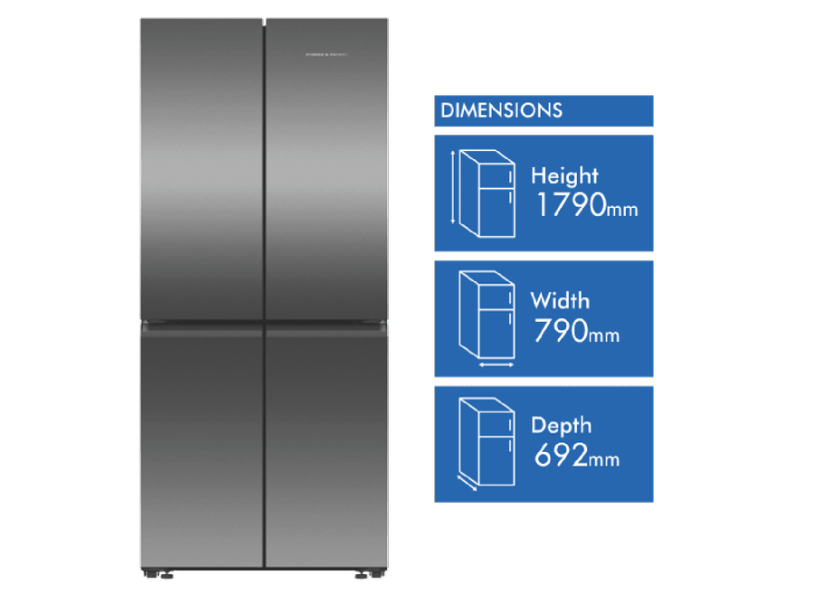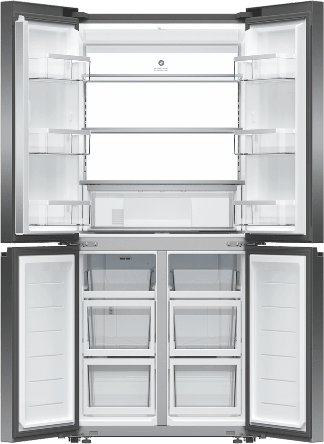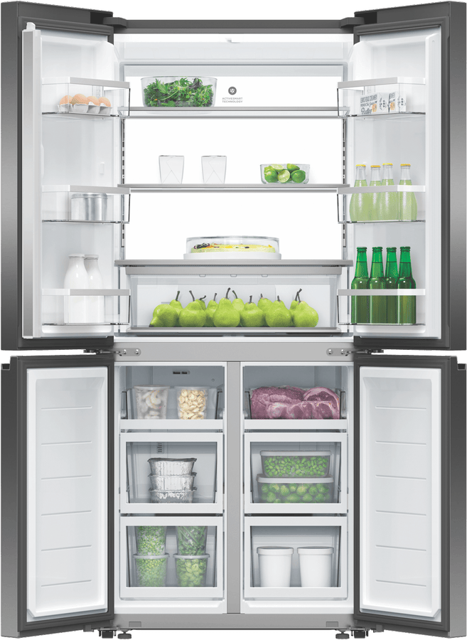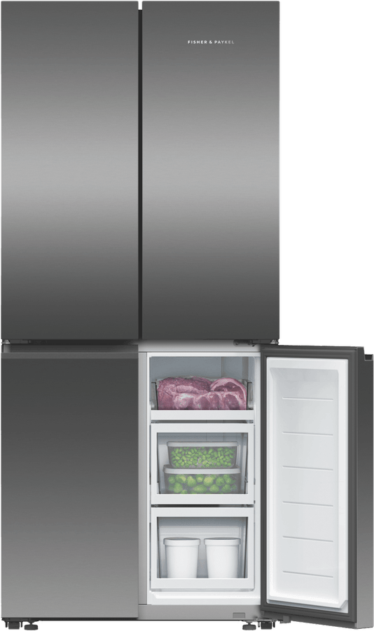 Make a statement with this sleek and modern Fisher & Paykel 498L Quad Door Refrigerator. Boasting a stylish black stainless steel finish, this fridge combines ample storage with advanced cooling technology for exceptional food preservation. The generous 498 litre capacity caters to big households, with dedicated spaces for fresh food, frozen items, deli snacks and drinks. Flexible shelving, humidity controlled bins and easy slide drawers allow you to customize the interior to suit your storage needs. Wi-Fi connectivity and ActiveSmart Foodcare take the guesswork out of maintaining food quality. ActiveSmart adjusts cooling on demand to keep ingredients fresher for longer, while the companion app lets you control settings and track performance from anywhere. Energy efficiency is a high priority, with an impressive 5 star rating to help save on running costs. Quiet operation keeps noise to a minimum for uninterrupted enjoyment. With a sleek built-in design, flexible storage solutions and smart cooling technology, this Fisher & Paykel French door refrigerator streamlines meal prep and entertaining for busy households. The manufacturer’s part number for this product is RF500QNB1. Discover the modern way to refrigerate with Fisher & Paykel.