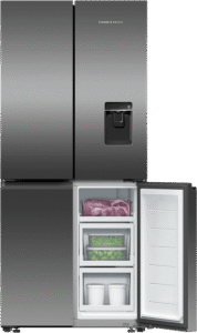 Keep your food fresh and organized with the Fisher & Paykel 498L Quad Door Refrigerator. This spacious fridge features four doors and flexible storage options to fit all your family’s needs. The sleek black stainless steel finish adds a modern touch to any kitchen. With a total capacity of 498 litres, including a 324 litre fridge and 174 litre freezer, you’ll have plenty of room for all your groceries. The fridge’s ActiveSmart technology adjusts cooling based on usage patterns for optimum food preservation. Dual humidity controlled bins keep fruit and veggies crisp, while the ice and water dispenser delivers refreshing chilled water and ice on demand. Wi-Fi connectivity lets you control and monitor your fridge from your smartphone. This fridge’s energy rating of 4.5 stars means it operates efficiently to help reduce your energy bills. For convenient access throughout the day, this Fisher & Paykel fridge has dual opening doors. Bring stylish and functional refrigeration into your home with the Fisher & Paykel 498L Quad Door Fridge. The manufacturer’s part number for this product is RF500QNUB1.