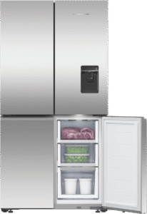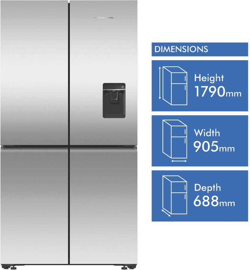 Enjoy the peace of mind of secure food storage with the Fisher & Paykel 538L Quad Door Refrigerator. This French door fridge boasts an impressive total capacity of 538 litres, with a spacious 341 litre fridge compartment and ample 197 litre freezer. Its sleek stainless steel finish and silver colouring will complement any modern kitchen aesthetic. The four convenient doors provide easy access from multiple angles – perfect for busy family life. The ice and water dispenser delivers refreshing chilled water and ice on demand. ActiveSmart technology automatically adjusts cooling based on usage patterns, ensuring optimum temperature control and energy efficiency. The variable temperature zone allows you to customize cooling for different foods.Additional handy features include auto ice maker and door alarms. Its energy rating of 4 stars means this fridge meets energy efficiency standards for electrical appliances in Australia and New Zealand. As part of the Fisher & Paykel Series 7 range, you can expect the superior build quality and innovative design that Fisher & Paykel is renowned for. With dimensions of 905mm width, 1790mm height and 688mm depth, this fridge will fit most standard kitchen spaces. The manufacturer’s part number for this product is RF605QNUVX1. Bring the convenience of quad-door refrigeration into your home with the Fisher & Paykel 538L model.