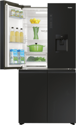Keep your fresh and frozen foods in optimal condition and neatly organised thanks to this Haier 508L Quad Door Refrigerator HRF580YHC. Flexible storage solutions include two adjustable glass shelves to make room for fresh produce, drinks and everyday essentials, as well as Haier’s SwitchZone allowing you to switch between fridge and freezer in the bottom right compartment with a temperature range of between -18°C to +5°C. This Haier fridge has an efficient 4.5 Star Energy Rating, a water dispenser, and MultiZone Air cooling for effective airflow and maximum freshness throughout.