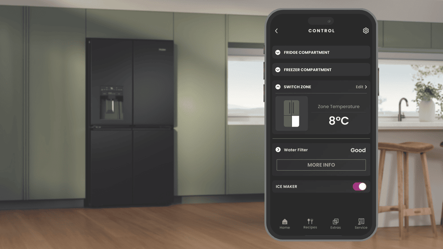 With filtered water and ice both available through the door, this large capacity model is the height of convenience, including two adjustable temperature areas within the fridge and the freezer – SwitchZone and My Zone – so you can create ideal conditions for different foods.