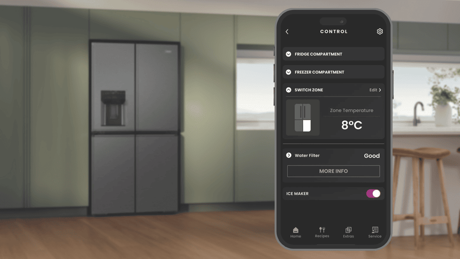 With filtered water and ice both available through the door, this large capacity model is the height of convenience, including two adjustable temperature areas within the fridge and the freezer – SwitchZone and My Zone – so you can create ideal conditions for different foods.