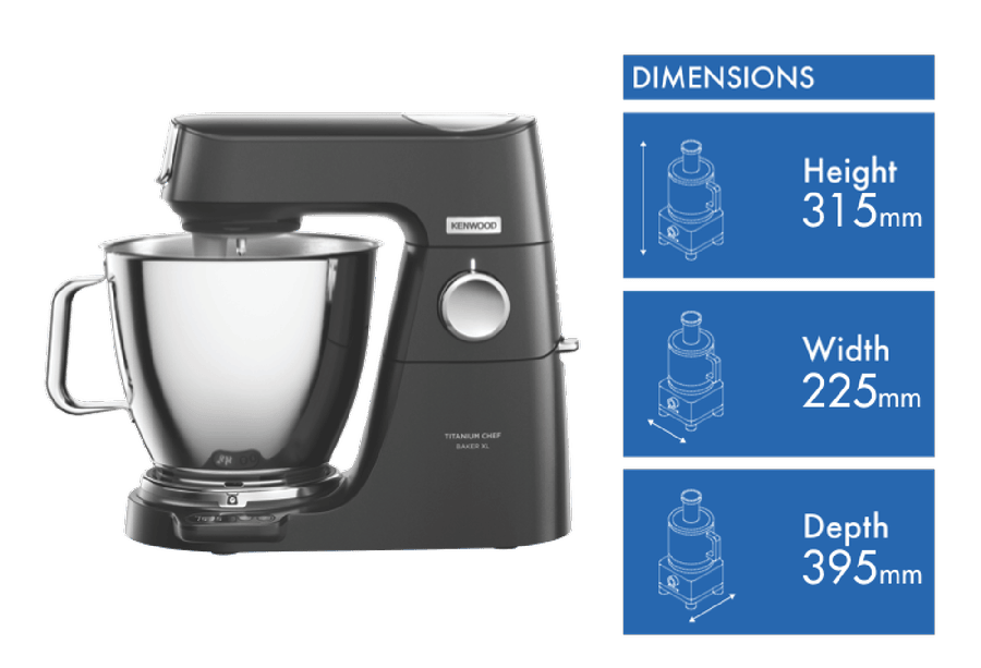 Take your baking skills to the next level with the powerful Kenwood Titanium Chef Baker XL Stand Mixer in sleek black. This high-performance 1200W stand mixer is built to handle even the most ambitious recipes with its generous 7 litre stainless steel bowl and additional 5 litre nesting bowl. The digitally controlled ChefMotor delivers smooth, quiet operation while the EasyWeigh scales ensure perfect results every time. With over 25 optional attachments available, you’ll have the versatility to knead bread dough, whisk cream, grind meat and much more. Key features include the patented beater, whisk and dough hook that are all dishwasher safe for easy cleaning. At 225mm high, 370mm wide and 400mm deep, the Kenwood Titanium Chef Baker XL Stand Mixer makes a stunning addition to any kitchen. Backed by Kenwood’s impressive 10 year warranty, this stand mixer delivers professional-grade power and reliability for the passionate home baker. The manufacturer’s part number for this product is KVL85004BK. Seize the chance to step up your baking with the Kenwood Titanium Chef Baker XL today.