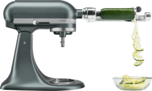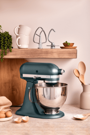 Bring your baking to life with the KitchenAid Artisan Stand Mixer in calming Juniper green. This full metal mixer features planetary mixing action with 10 speeds controlled by an easy slide mechanism, ensuring ingredients are thoroughly combined. The convenient tilt head design makes adding ingredients simple, while the included 4.7L and 2.8L bowls give you flexibility for different recipe sizes. You’ll appreciate the complete accessory set with wire whisk, flex edge beater, dough hook, pastry beater and pouring shield – all dishwasher safe for easy cleanup. Assembled in the USA with quality craftsmanship backed by a 5-year warranty. Model 5KSM195PSAJP.