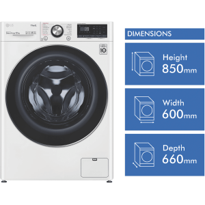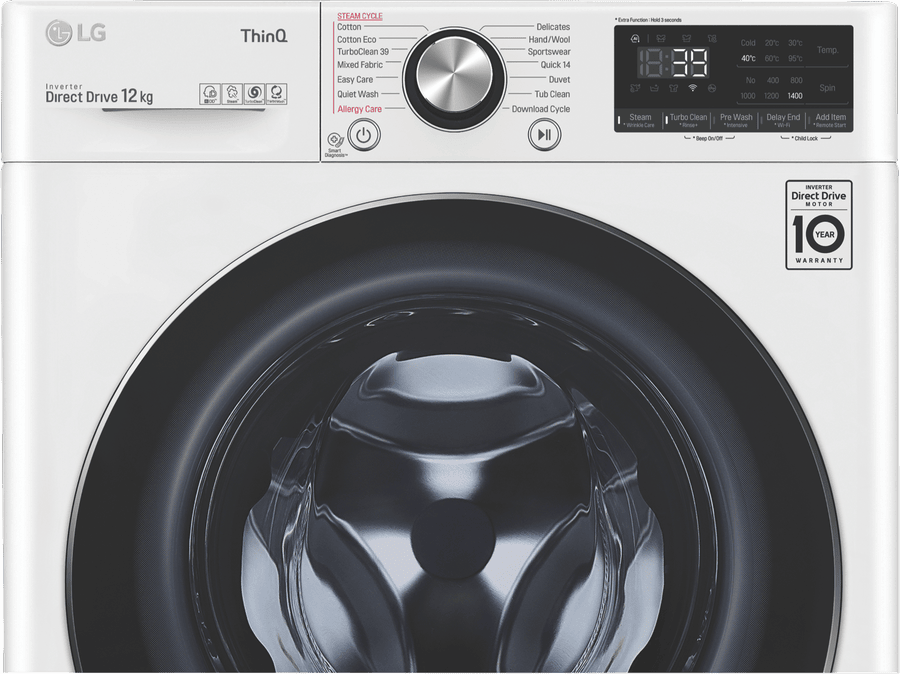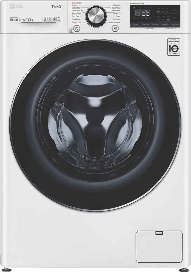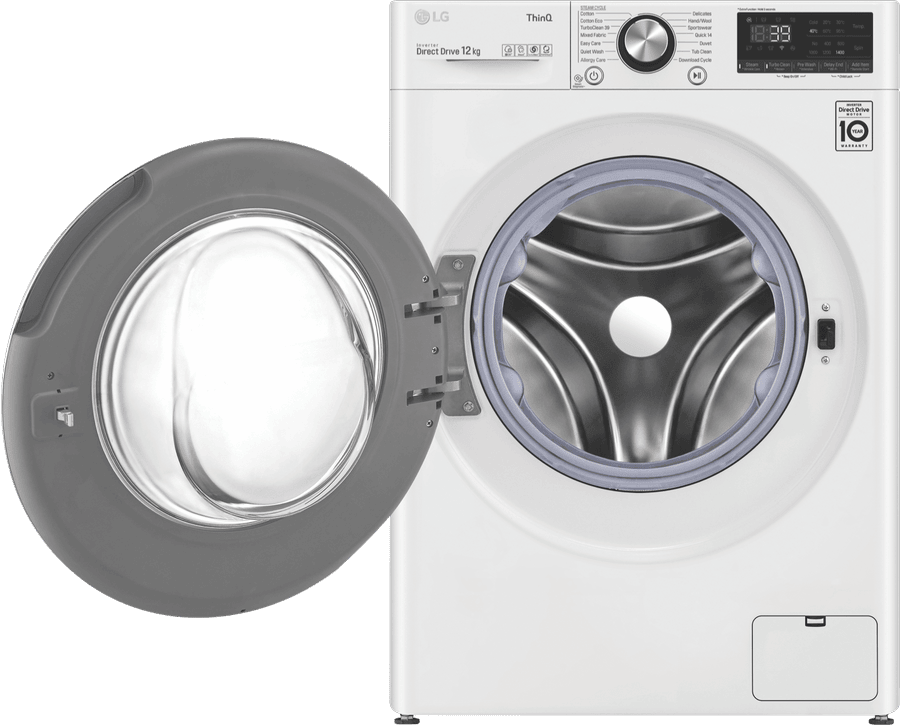 Enjoy the convenience of a powerful 12kg washing machine from LG that makes laundry day a breeze. With a generous 12kg capacity, the LG Front Load Washer can handle large loads in a single wash, saving you time and effort. The White finish gives this washer a clean, classic look suitable for any laundry room. Reaching max spin speeds of 1400rpm, this machine removes more water from clothes to slash drying times. Boasting a highly efficient 4.5 star WELS water rating and 5 star energy rating, the LG Front Load Washer is designed for low water and energy use. It consumes just 103 litres per wash on the default Cotton Eco 40C 1400rpm cycle. The LG Front Load Washer is packed with 12 diverse wash programs like Allergy Care and Delicates to suit any fabric. The handy Steam function penetrates deep into fabric fibers to remove odors and allergens. Meanwhile, the Turbo Clean 39 program tackles really dirty clothes in just 39 minutes. With intelligent features like AI Direct-Drive and Inverter Direct-Drive Motor, this washer optimizes wash performance while enhancing durability. It even provides easy access for adding items during a cycle. Covered by a 2 year LG warranty, the LG 12kg Front Load Washer WV9-1412W makes laundry a pleasure. Discover how this time-saving washer can streamline your laundry routine today.