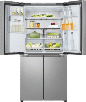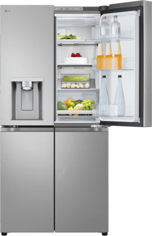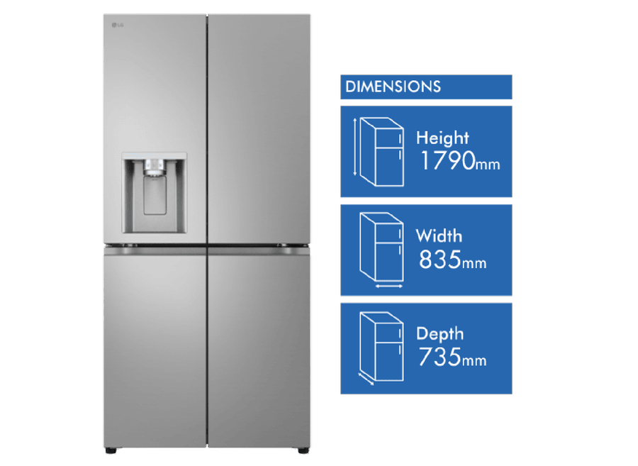 Elevate your kitchen with the sleek and spacious LG 506L French Door Refrigerator. This stylish fridge boasts a stainless steel finish and a generous 506L capacity, with 286L dedicated to fresh food storage and 209L for frozen goods. Enjoy the convenience of an ice and water dispenser, complete with LG’s innovative UVnano technology for enhanced hygiene. The Smart Inverter Compressor ensures optimal performance and energy efficiency, earning this fridge an impressive 4.5 star energy rating. The slim design fits perfectly in an 850mm cavity, while the Spaceplus Ice System maximizes interior space. Stay connected with LG ThinQ smart technology, allowing you to monitor and control your fridge remotely. Measuring 835mm wide, 1790mm high, and 735mm deep, this French door refrigerator is designed to fit seamlessly into your kitchen layout. The manufacturer’s part number for this product is GF-L500PL. Experience the ultimate in refrigeration with LG’s 506L French Door Fridge and enjoy a 2-year manufacturer’s warranty for added peace of mind.