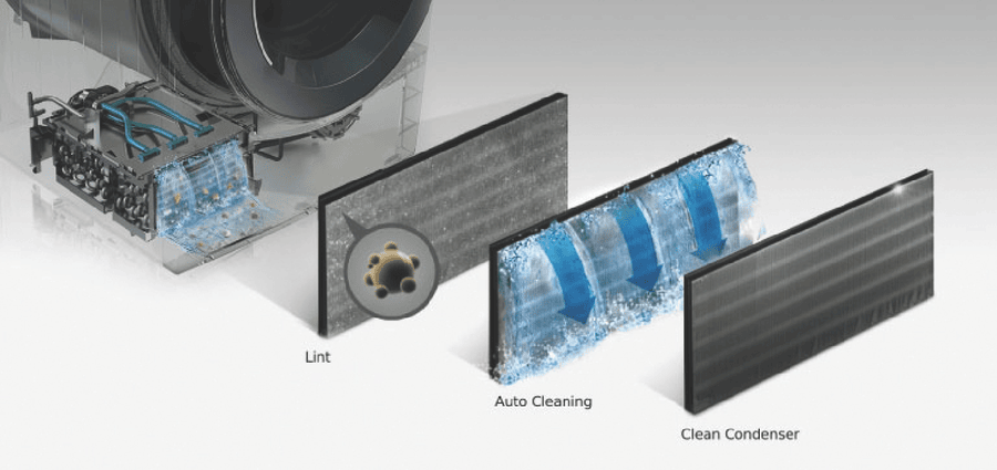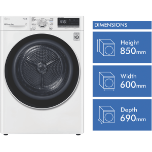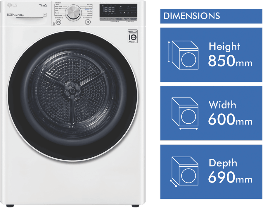 Equipped with LG’s Inverter Compressor and heat pump technology to make a Super-Efficient 9 Star Energy Rating possible, this LG Heat Pump Dryer DVH5-08W offers both energy savings and optimal care of clothing in an 8kg capacity stainless steel drum. A heat pump dryer dries fabrics carefully and efficiently and does not require venting to the outside so they’re perfect if you’re renting. This LG dryer is designed to care for what you wear with Sensor Dry cycles including Allergy Care, Easy Care, Wool, or Delicates for dedicated fabric treatment with no overdrying. Select a Time Dry cycle like Rack Dry in conjunction with the included Drying Rack for drying off wet hats, scarves or shoes. Its clever Auto Cleaning Condenser removes lint and dirt with its automatic condenser clean function; ensuring your dryer runs both optimally and hygienically. Plus, with LG ThinQ with Smart Pairing* this LG heat pump dryer automatically sets the best dry cycle based on the last wash in your connected LG front load washer. It is 850mm high, 600mm wide, and 690mm deep, so take careful measurements of where your dryer needs to fit, leaving enough room for the door to open. *Compatible smartphone required, Android 4.1.2 (JellyBean) or later or iOS 9 or later required for LG ThinQ application.