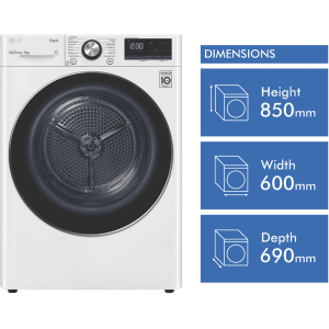 Equipped with LG’s Inverter Compressor and heat pump technology to make a Super-Efficient 9 Star Energy Rating possible, this LG Heat Pump Dryer DVH9-09W offers both energy savings and optimal care of clothing in a 9kg capacity stainless steel drum. A heat pump dryer dries fabrics carefully and efficiently and does not require venting to the outside so they’re perfect if you’re renting. This LG dryer is designed to care for what you wear with Sensor Dry cycles including Allergy Care, Easy Care, Wool, or Delicates for dedicated fabric treatment with no overdrying. Select a Time Dry cycle like Rack Dry in conjunction with the included Drying Rack for drying off wet hats, scarves or shoes. Its clever Auto Cleaning Condenser removes lint and dirt with its automatic condenser clean function; ensuring your dryer runs both optimally and hygienically. Plus, with LG ThinQ with Smart Pairing* this LG heat pump dryer automatically sets the best dry cycle based on the last wash in your connected LG front load washer. It is 850mm high, 600mm wide, and 690mm deep, so take careful measurements of where your dryer needs to fit, leaving enough room for the door to open. *Compatible smartphone required, Android 4.1.2 (JellyBean) or later or iOS 9 or later required for LG ThinQ application.