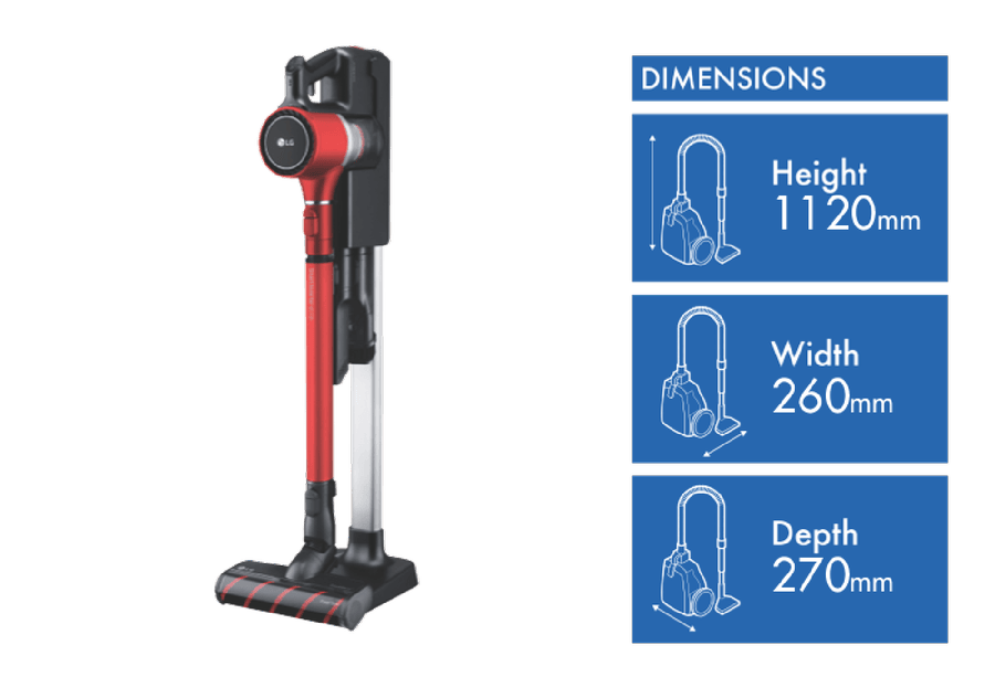 Get everything ever needed for a deep clean with the LG A9 CordZero Multi Stick Vacuum A9N-MULTI. LG’s Aeroscience technology utilises strong mini whirlwinds of airflow that separate out dust particles white the Inverter Motor rotates at high speed for effective suction. Included is the Power Drive Nozzle that rotates the roller while vacuuming to effectively pick up dust and other floor particles through a 5 Step Filtration System capturing particles down to 2.5 microns in size. The filters are also removable and washable for a longer service life. Using the Normal mode the A9 CordZero has up to 50 minutes(1) of battery life and also has an interchangeable battery for longer cleaning sessions. The CordZero is very flexible allowing for wall mount storage on its charging dock, floor standable and a Compact mode for a small size footprint in the home. Easily control power with one touch of the thumb including a turbo mode and keep overall control with four different telescopic pipe lengths and an ergonomic Opti-balanced Handle. Make use of the included accessories like the Combination and Crevice tools to get into every nook and cranny. The Flex model of the Cord Zero range comes with two batteries, Multi-Surface and Hard Floor Power Drive Nozzles plus an additional Handy Tool Kit. The vacuum is covered by a total 10 Year Warranty(2) for long term peace of mind. Disclaimers: (1) With one battery directly charged from charging station, run time without Power Drive Nozzle for each mode – Normal, Power, and Turbo is up to 50 mins, 11 mins and 6 mins respectively. (2) 12 month Battery warranty, 2 years parts and labour, 8 additional years on motor (parts only).