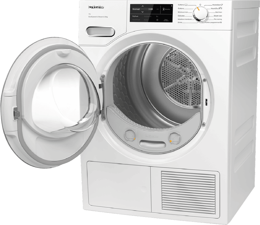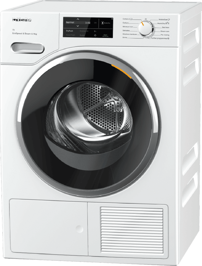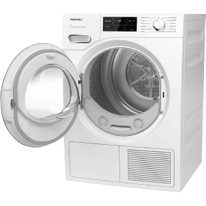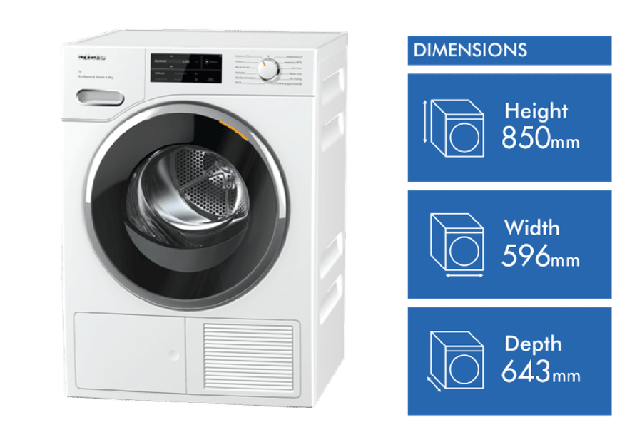 This white Miele heat pump dryer has the capacity to dry 9 kg (1kg = the weight of one dry towel) or one king doona, which is perfect for households of five or more. The large drum means you do more in each load and fewer loads, and it gives clothes more room to move around so they dry thorougly, creases are reduced and you spend less time ironing. A heat pump dryer dries fabrics more carefully and efficiently than other types of dryers, which protects your clothes and helps with power bill savings. Heat pump dryers don’t need to be vented outside so they’re perfect if you’re renting. Its very high 10 star energy rating enables you to increase your power bill savings. Plus, select the setting for best results with the white Miele TWL 780 WP’s 22 types of drying programs. It has delicates program. This white heat pump dryer is 850mm high, 596mm wide, and 643mm deep, so take carfeful measurements of where your dryer needs to fit, leaving enough room for the door to open.