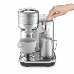 Discover barista-style coffee drinks with the Nespresso Vertuo Creatista Capsule Machine. This premium stainless steel capsule coffee maker delivers café-quality beverages in the comfort of your home. With a powerful 1300-1500 watt heating system, 2L water tank, and patented capsule recognition technology, this Nespresso machine brews freshly ground coffee, espresso, and lungo. The integrated aeroccino milk frother lets you create silky smooth lattes and cappuccinos in a variety of textures. Connect via Bluetooth to access exclusive coffee recipes through the Nespresso app. With a sleek brushed finish, this Nespresso Vertuo Creatista coffee machine will complement your kitchen decor. Experience the full flavor and aroma of each coffee capsule with 19 bars of pressure that unlock the finest characteristics. The capsule container holds up to 10 small or 6 large capsules for convenience. Enjoy the versatility of 3 milk temperatures and textures at the touch of a button. This Nespresso Vertuo Creatista capsule coffee machine delivers speed, simplicity and versatility for coffee lovers. The manufacturer’s part number for this product is BVE850BSS4IAN1. Check out the Nespresso Vertuo Creatista today to elevate your home coffee experience.