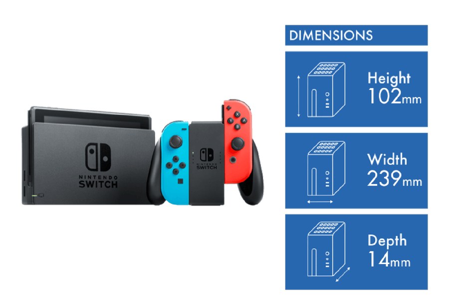 Get ready to play your favorite games anywhere you go with the vivid Nintendo Switch Console in eye-catching neon red and blue. This versatile home gaming system lets you enjoy HD gaming at home or on the go. Simply dock it to your TV to play immersive big-screen games, then undock it to keep the fun going in handheld mode with its 6.2-inch LCD touchscreen. Featuring motion controls, HD rumble, and 32GB of internal storage, the Nintendo Switch opens up exciting new ways to game with its Joy-Con controllers. These innovative controllers can be used separately, together, or shared for multi-player action. Packed with the latest technology, the Nintendo Switch console delivers high-definition visuals, surround sound audio, and compatibility with Nintendo Switch game cartridges for non-stop entertainment. Weighing just 0.39kg with a slim, compact design, this portable home console goes wherever you do. The manufacturer’s part number for this product is 99282. Bring home the all-in-one Nintendo Switch console and experience gaming freedom.