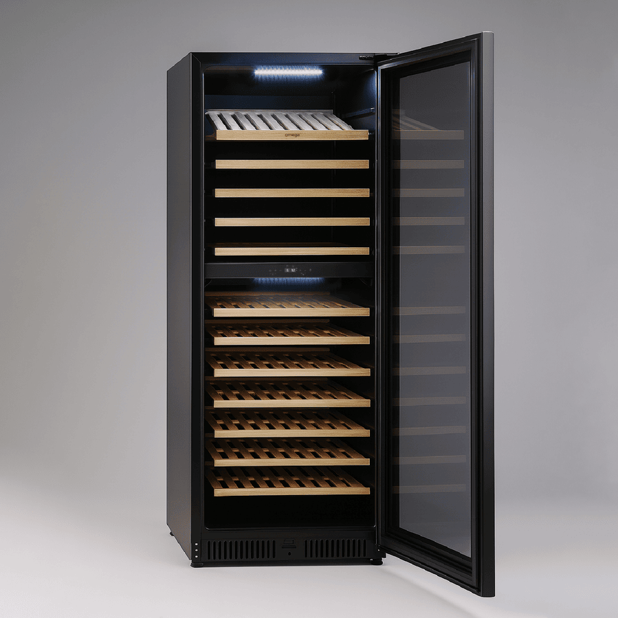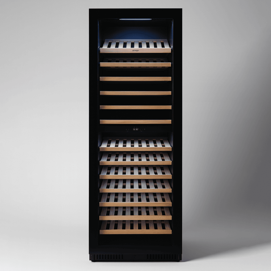 For the serious collector, the Omega OCW166SB Dual Zone Wine Cabinet offers unmatched storage, precision and presentation. With a capacity for up to 169 bottles, this premium unit features dual-zone temperature control, telescopic timber shelves, and a dedicated display shelf to showcase your most prized vintages. Finished in sleek black with a UV-protected triple-glazed door, it’s built for both performance and style — whether integrated seamlessly or standing proudly on its own.