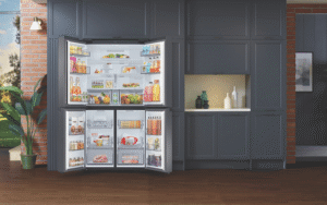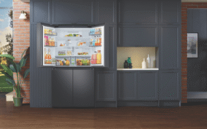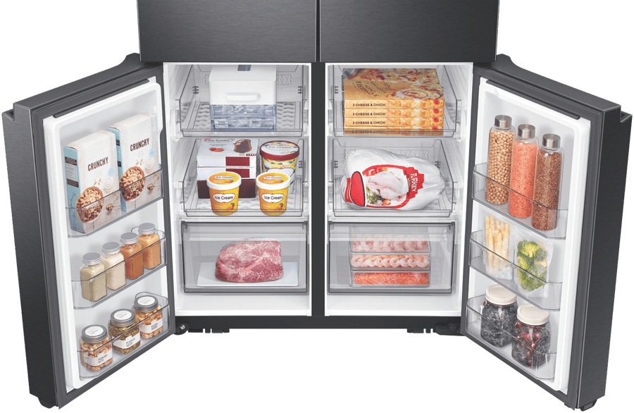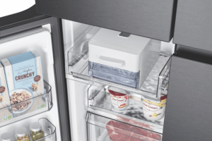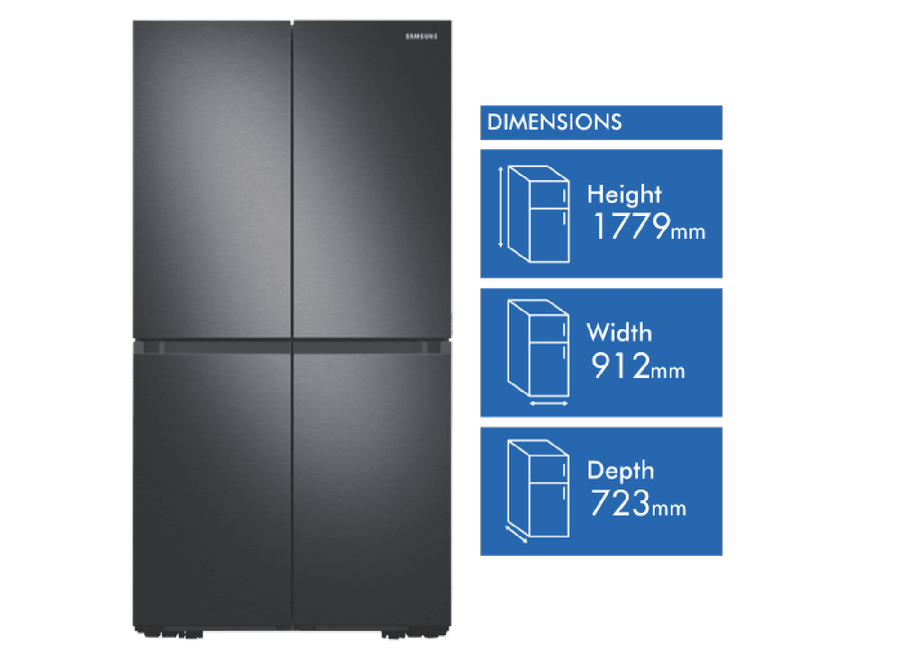 Your kitchen can stand out with an exceptional and stylish appliance in the Samsung 649L French Door Refrigerator SRF7100B. The exterior ‘built-in’ and elegant flat door design has antimicrobial coating placed upon its handle preventing fridge degradation from micro-organisms. Also, the exterior Anti-Fingerprint Finish prevents the build-up of hand marks, keeping your fridge exterior looking clean and pristine. The All Around Cooling Technology keeps your fridge consistently cool; this feature consistently monitors the current temperature and disperses cool air through the internal cabin via multiple aligned air vents. Power Cool and Power Freeze both work to quickly cool or chill newly stored food or drink products. Store a wide variety of soft drinks, juices, and milks in the Big Bottle Door Bins; using these helps create even more room within the internal fridge space. Keeping your wide range of fruit and vegetables fresh and tasty in the large capacity Big Crispers. The Moveable Twist Ice Maker produces plenty of ice cubes to stay cool during the warm weather months, simply twist and the ice dispenses. When the temperature decreases and there isn’t a need for ice you can simply detach and remove the machine to gain extra freezer space. The stylish and minimal LED display with accessible controls allows you to adjust the fridge settings and monitor the performance of your fridge. Size doesn’t affect quality; the 649L French Door Refrigerator fits in an Australian standard 1800mm cavity and still has both a dual freezer space and extensive storage space.
