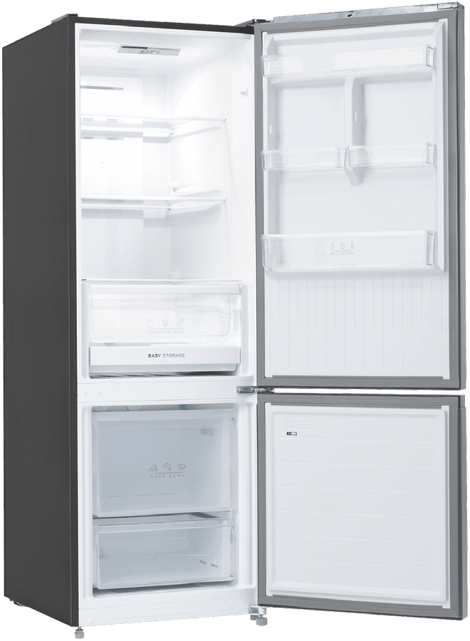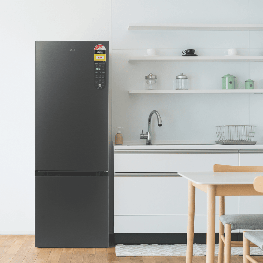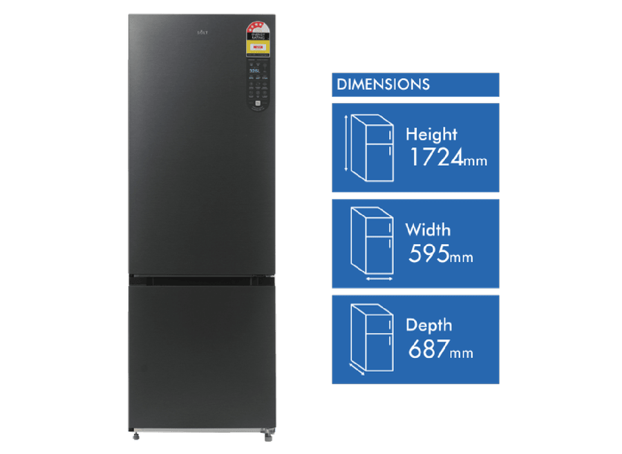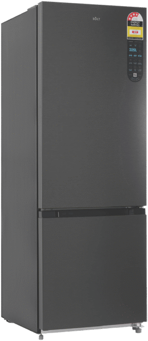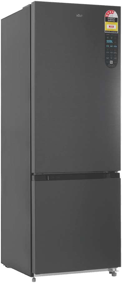 Bring stylish refrigeration to your home with the Solt 325L Bottom Mount Refrigerator. With its black exterior and dark silver finish, this right-hinge fridge adds a modern touch to any kitchen. The generous 325 litre total capacity includes ample 235 litre fridge space for fresh foods and 90 litres of freezer capacity, earning it a 4 star energy rating for efficiency. Adjustable shelves and door pockets provide customizable storage options, while the flex zone drawer and freezer drawers keep ingredients organized. Additional highlights like the Inverter compressor, digital temperature control, and LED lighting ensure this bottom mount refrigerator performs as good as it looks. With reversible doors, adjustable feet, and tempered glass shelves, the Solt makes using and installing this fridge a breeze. Durable and thoughtfully designed, the Solt keeps groceries fresher for longer. Backed by a 2 year manufacturer’s warranty, this refrigerator provides reliable and energy efficient refrigeration. The manufacturer’s part number for this product is GGSBM325DS. Bring home the Solt Bottom Mount Fridge for high-capacity refrigeration with modern style.