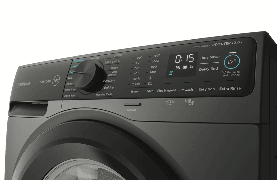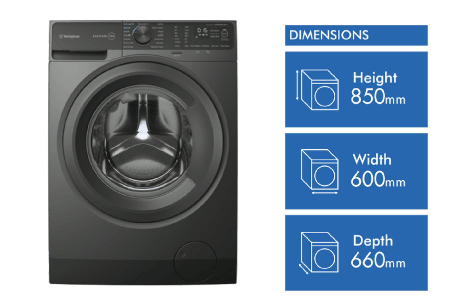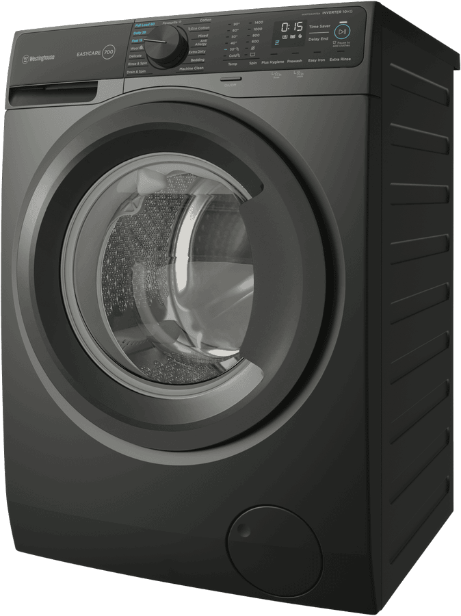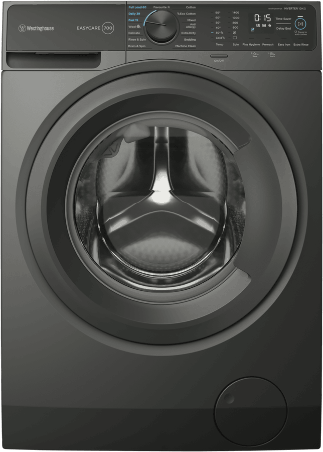 This Westinghouse 10kg front load washing machine offers powerful and efficient performance for busy families. With a generous 10kg capacity, the WWF1044M7SA makes light work of large loads. The 1400rpm maximum spin speed means less time hanging clothes out to dry. And a 4.5 star WELS water rating plus 5 star energy rating mean you’ll save water and power. The 15 versatile wash programs on this metallic grey EasyCare model take care of everything from machine cleaning to anti-allergy and delicate fabrics. Options like Vapour, Extra Rinse and Delay End give you extra control. While the easy-access front loader design is gentle on clothes. From school uniforms to bedding, the Westinghouse WWF1044M7SA washing machine quietly and efficiently washes for years to come. It features a two year manufacturer’s warranty for peace of mind. The manufacturer’s part number for this product is WWF1044M7SA. Shop now for an eco-friendly laundry solution.