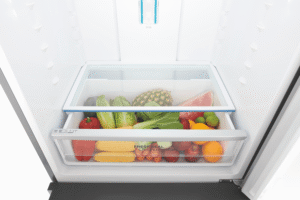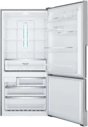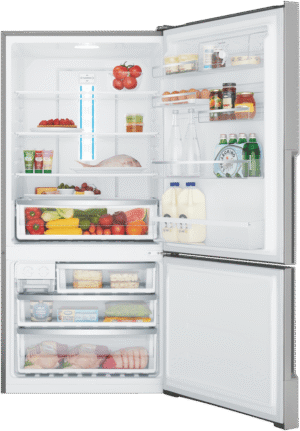 496L bottom freezer fridge, natural stainless steel with manual humidity-controlled crisper, 5 star energy rating, SpillSafe glass shelves, telescopic runners on the freezer drawers & FlexStor adjustable storage solutions.