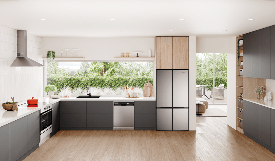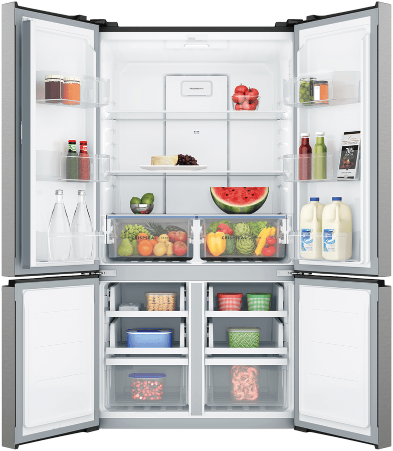 547L Quad Door fridge in a stainless look, designed to easily fit within a kitchen cavity with an ideal height of 1725mm. Features dual CrispSeal crispers, a sphere ice tray, and a 4-star energy rating.