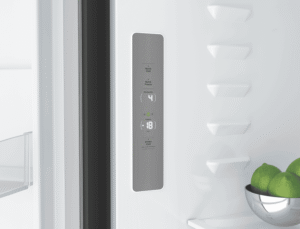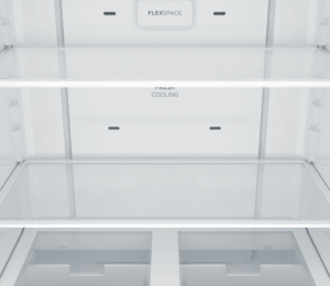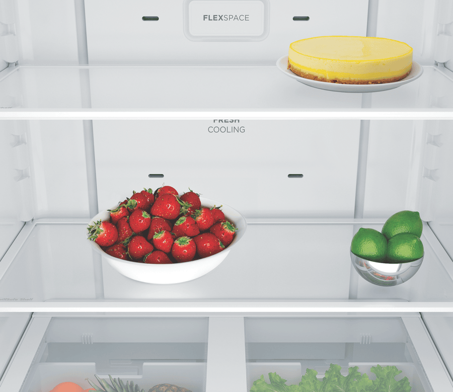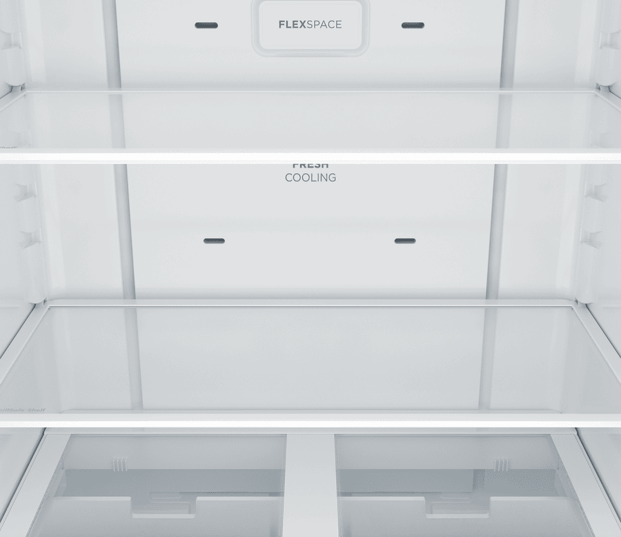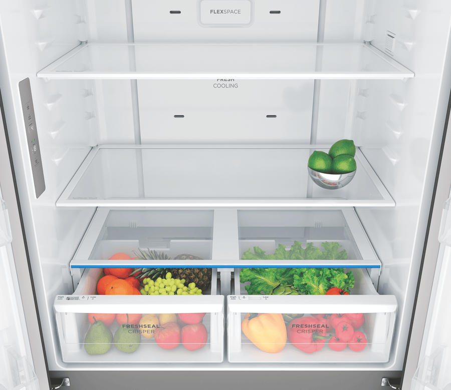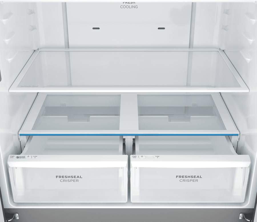 - FreshSeal and manual humidity crisper, SpillSafe shelves, full width door bins,