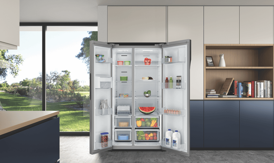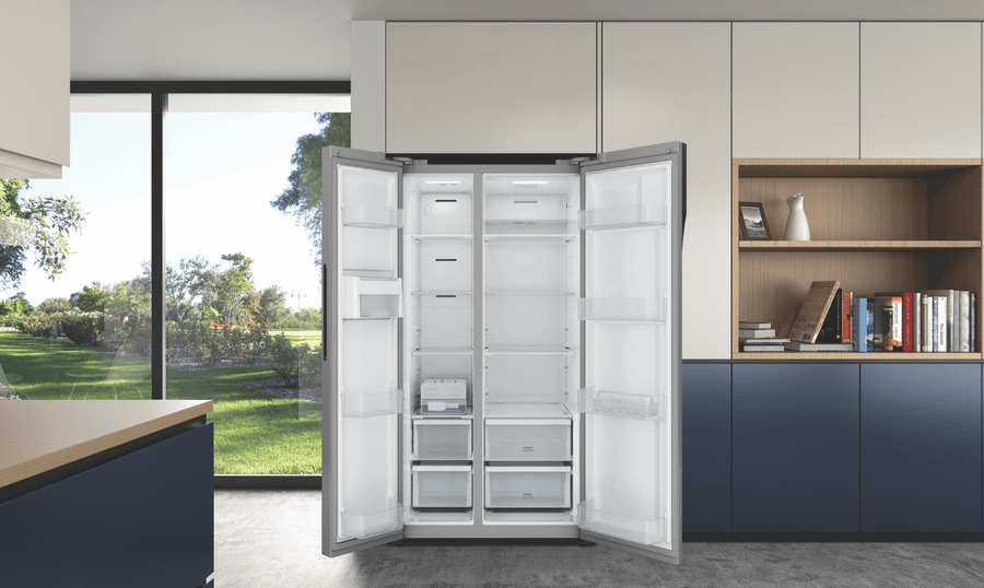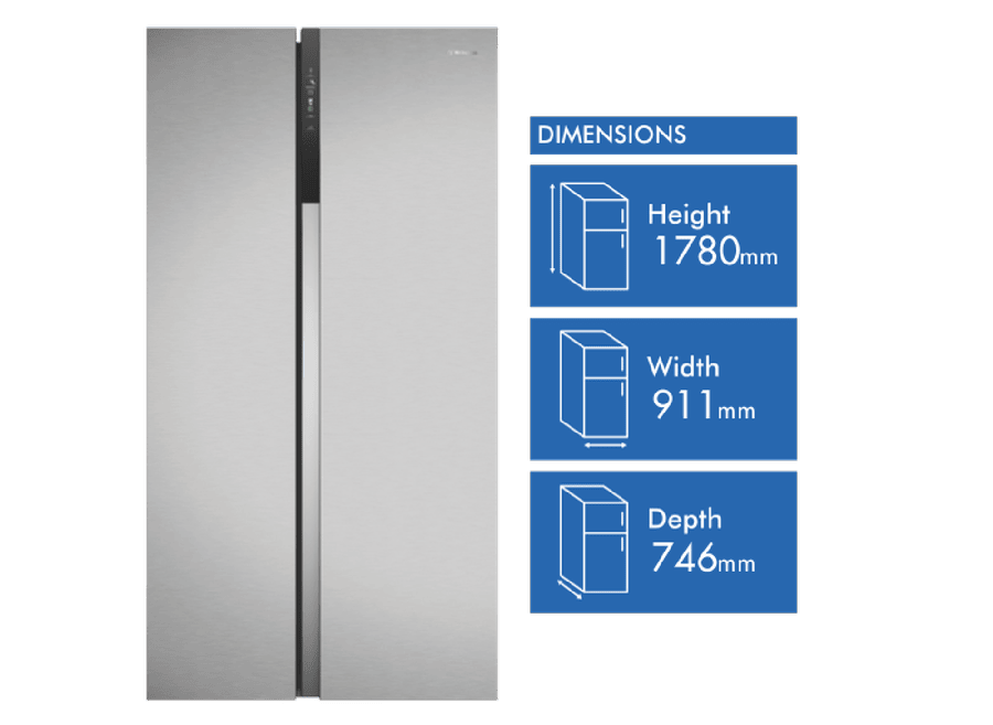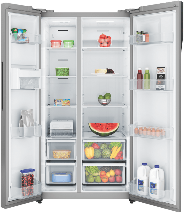 624L side by side fridge, silver with Dual FreshCrispers, Twist & Serve ice makers, Quick Chill and Quick Freeze functions and exceptional 6-star energy rating.